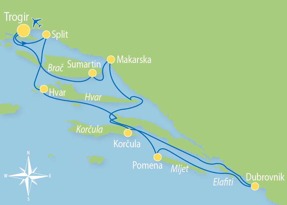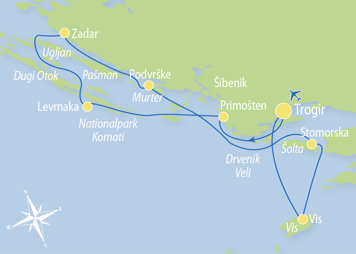 Vozimo se duž južne obale otoka Brača i nakon nešto manje od sat i pol stižemo do poznatog „Zlatnog rata“ kod Bola, vjerojatno najpoznatije plaže na cijeloj jadranskoj obali. Strši gotovo 400 m u more, a vrh mu mijenja smjer s morskim strujama. Svakih nekoliko godina plaža gotovo potpuno nestane tijekom zimske oluje, da bi se nakon nekoliko dana ponovno pojavila u punom sjaju. Kako se ovdje već nekoliko godina ne smije sidriti u blizini plaže, mimo nje prolazimo vrlo polako kako biste barem mogli uživati u pogledu. Nastavljamo prema zapadnom kraju otoka kako bismo se posljednji put usidrili u uvali Lučice za dvosatnu stanku za kupanje. Zatim krećemo prema Trogiru gdje se vezujemo oko 15:00 sati. Trogir nazivaju i „gradom muzejom“ zbog svoje stare gradske jezgre koja je pod zaštitom UNESCO-a. Jednostavno je iskustvo šetati krivudavim kamenim ulicama popodne ili navečer i diviti se srednjovjekovnim svodovima i prekrasnim dvorištima. Obilazak starog grada u pratnji vodiča, nakon čega slijedi mogućnost večere u jednom od bezbrojnih restorana.