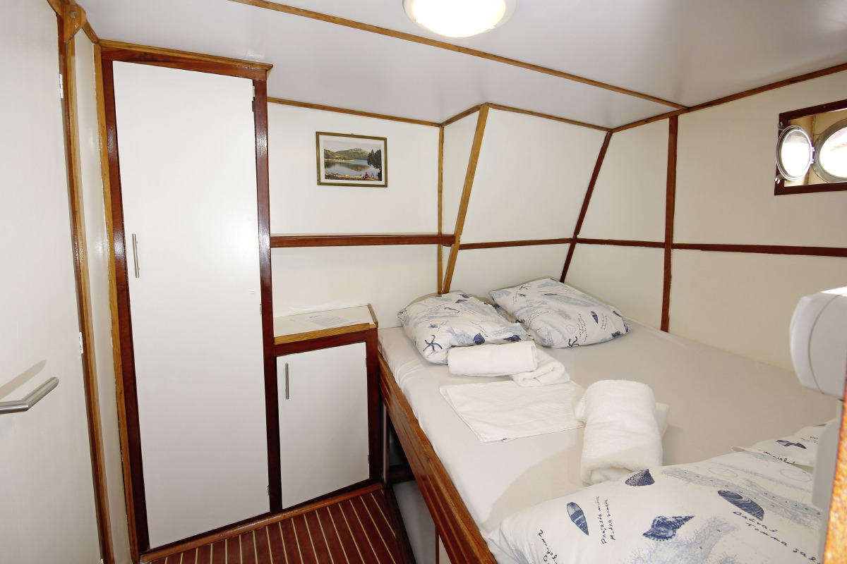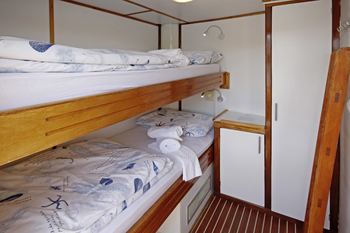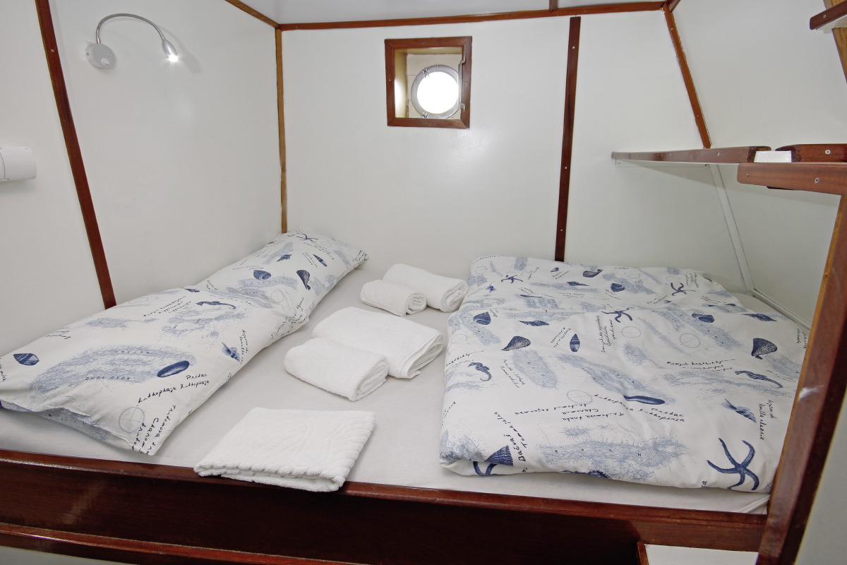 Potpalublje: 1 dvokrevetna kabina s krevetima na kat (br. 14), 2 trokrevetne kabine s francuskim ležajem i trećem krevetu iznad (br. 16, 17).