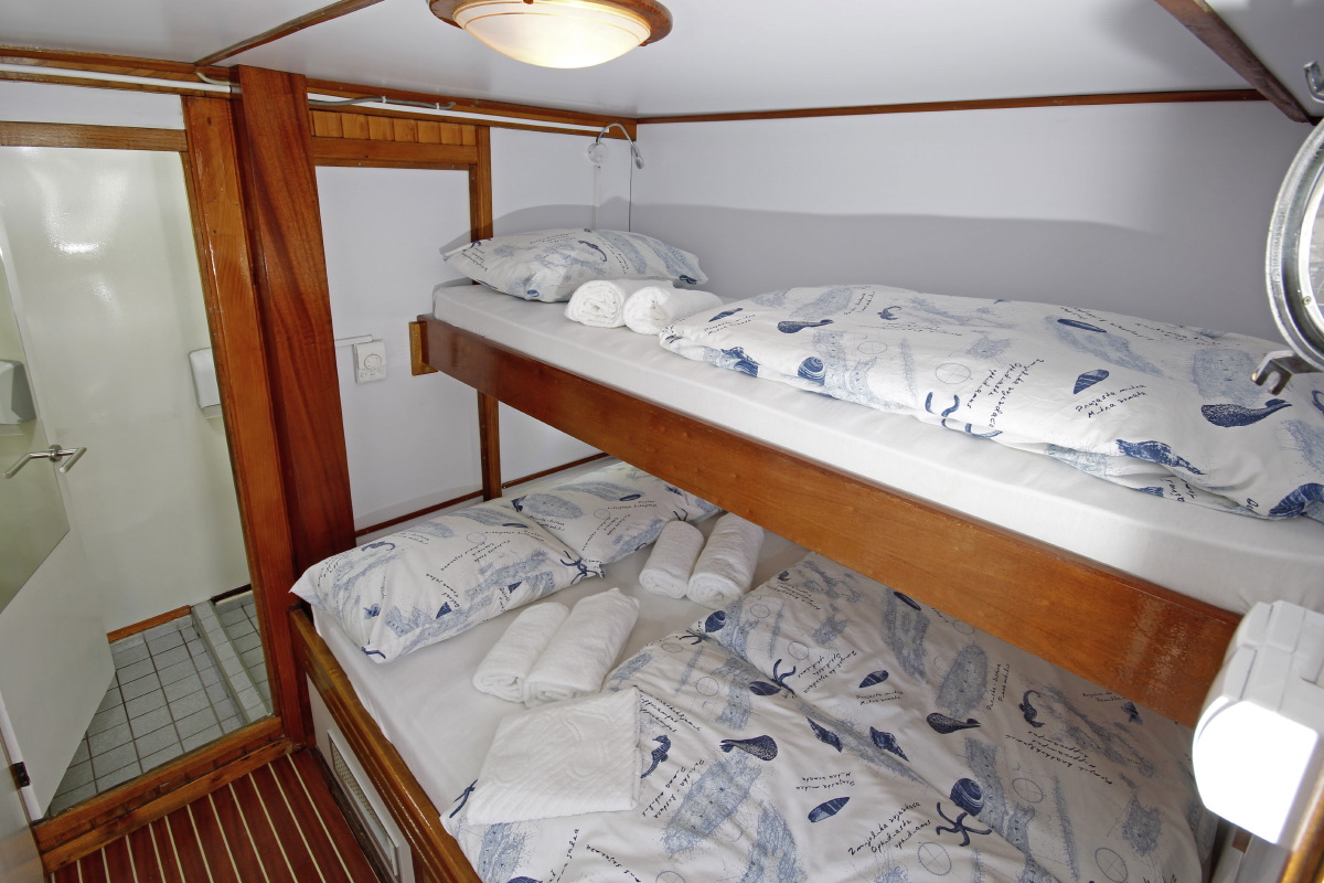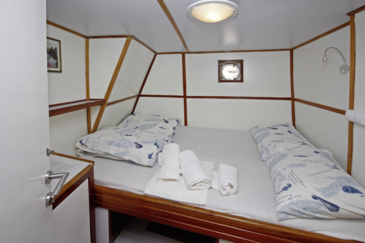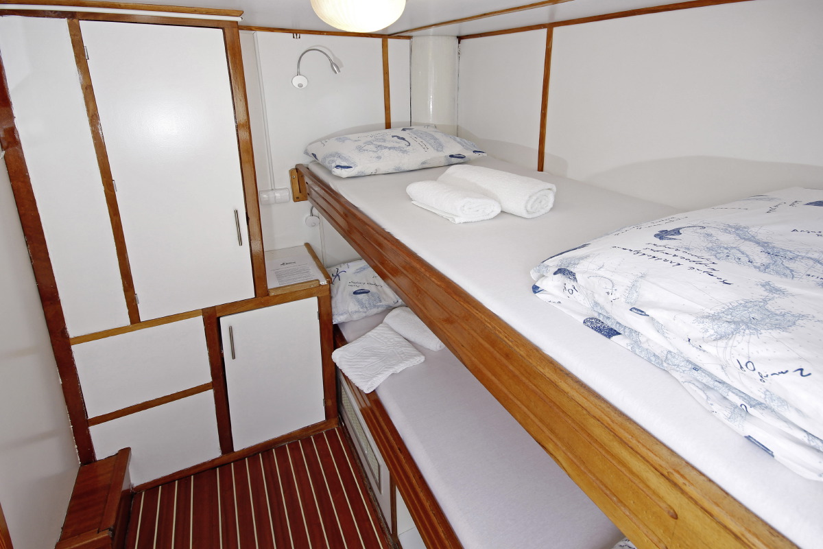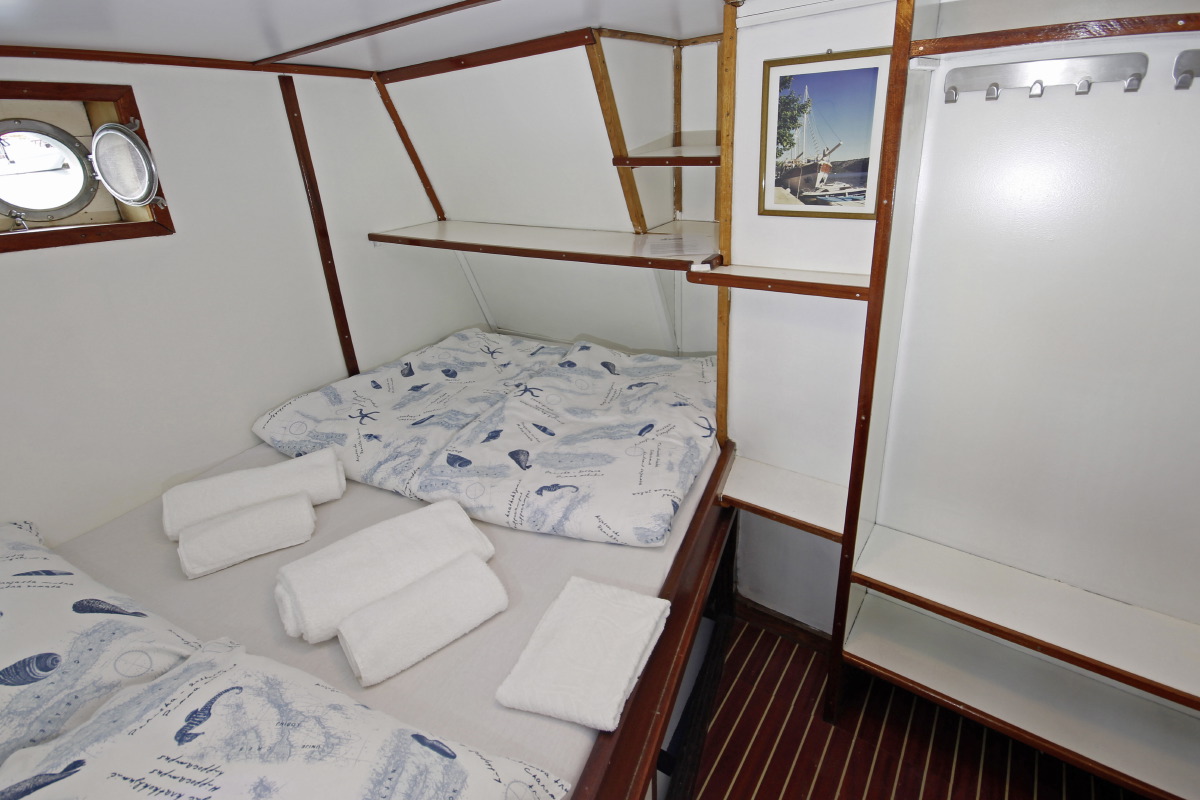 Potpalublje: 1 dvokrevetna kabina s krevetima na kat (br. 14), 2 trokrevetne kabine s francuskim ležajem i trećem krevetu iznad (br. 16, 17).