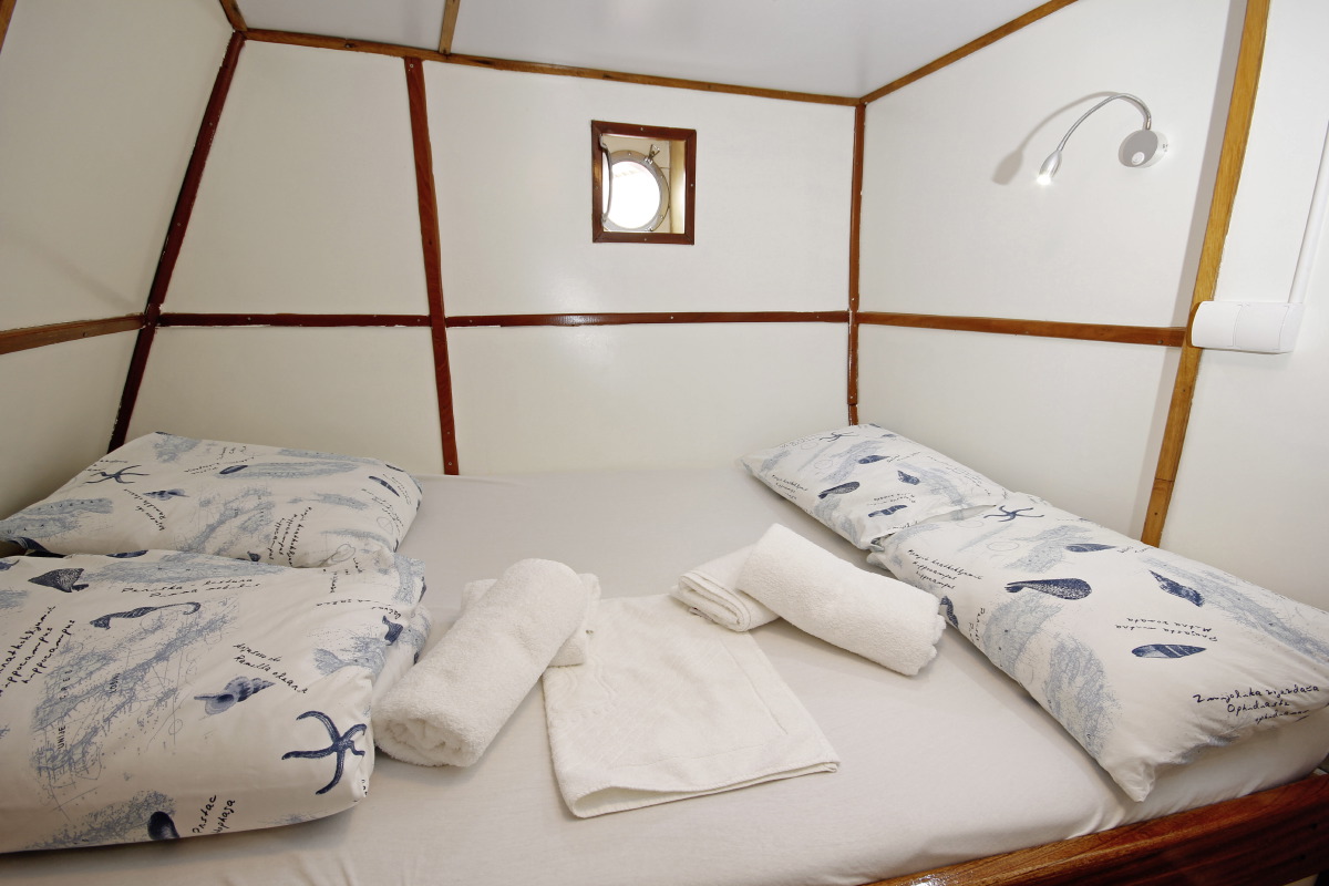 Glavna paluba: 3 dvokrevetne kabine s krevetima na kat, 3 dvokrevetne kabine s francuskim ležajem, 1 trokrevetna kabina s francuskim ležajem i trećem krevetu iznad.