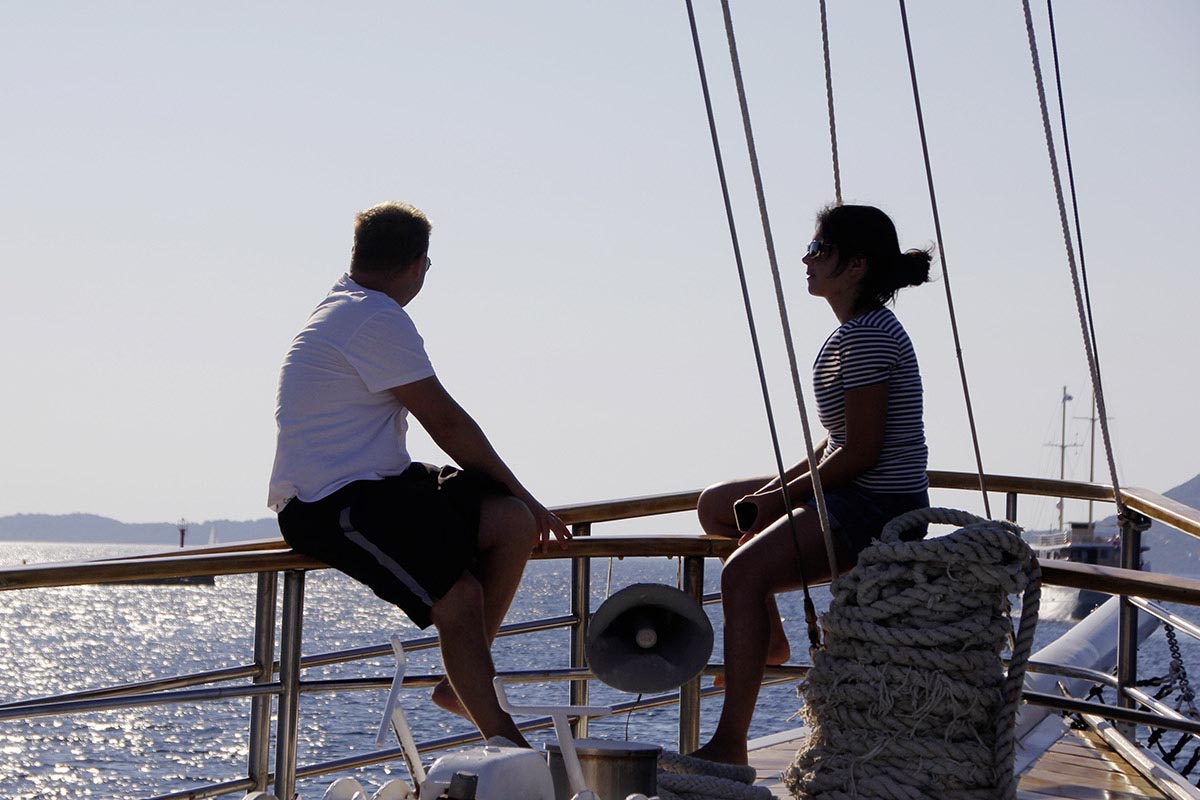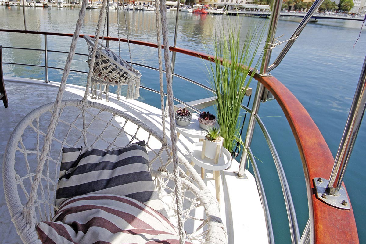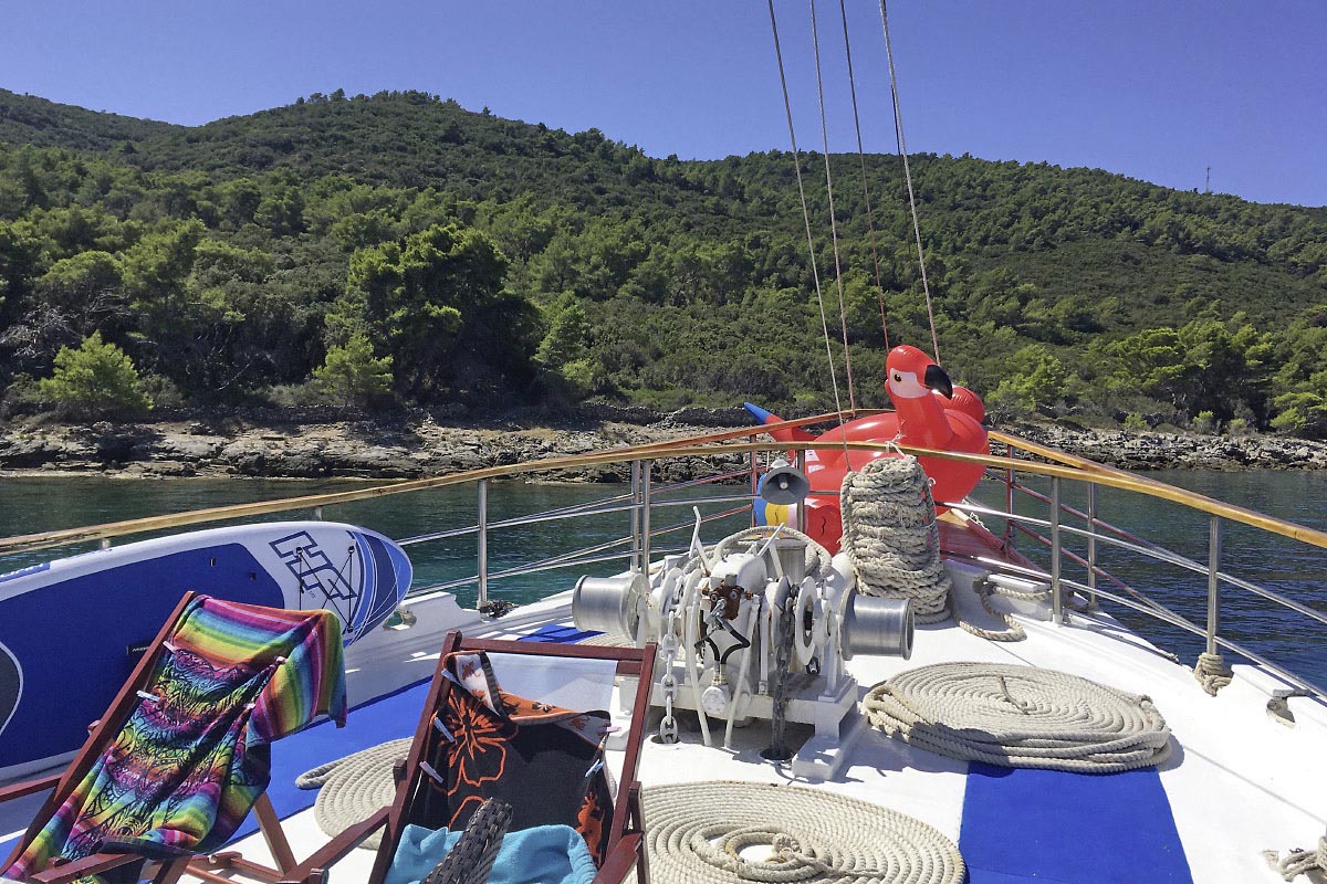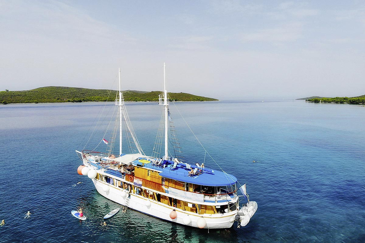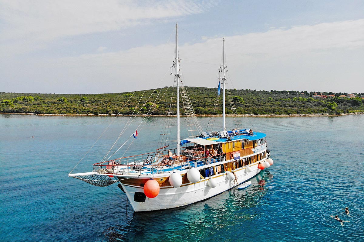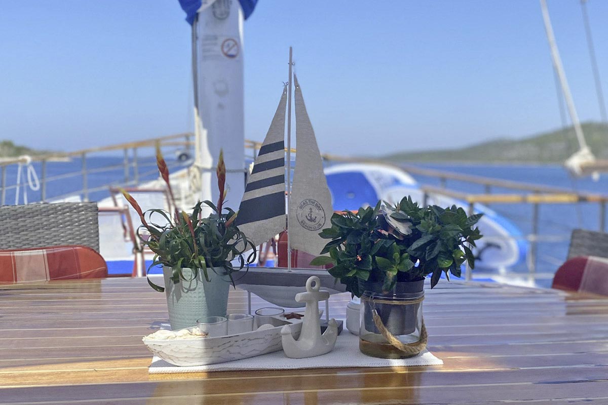 Naši gosti cijene opuštenu atmosferu na tradicionalnom drvenom brodu koji se ne može usporediti s modernim željeznim brodovima. Tijekom plovidbe možete se sunčati na jednoj od dvije sunčane palube, zajedno sjediti za velikim stolom ispred kormilarnice ili se prepustiti valovima da vas lagano ljuljaju u visećim stolicama na natkrivenoj krmi. U pauzama za kupanje u najljepšim uvalama dalmatinskih otoka, neki se gosti odvaže na hrabri skok s gornje palube, plutaju morem na jednom od luftića kojih ima na brodu ili se okušaju u stojećem veslanju (stand-up paddling). A ako ste nakon toga žedni, Larisa će vas razmaziti ledenim pivom, čašom vina ili koktelom.