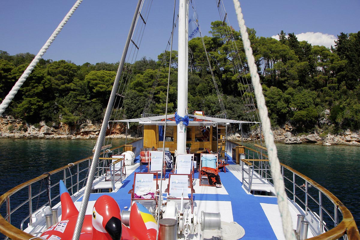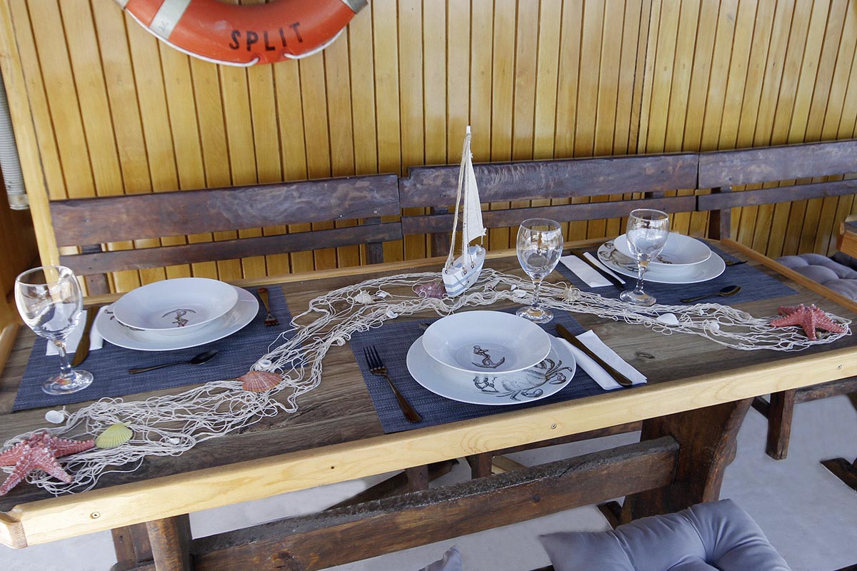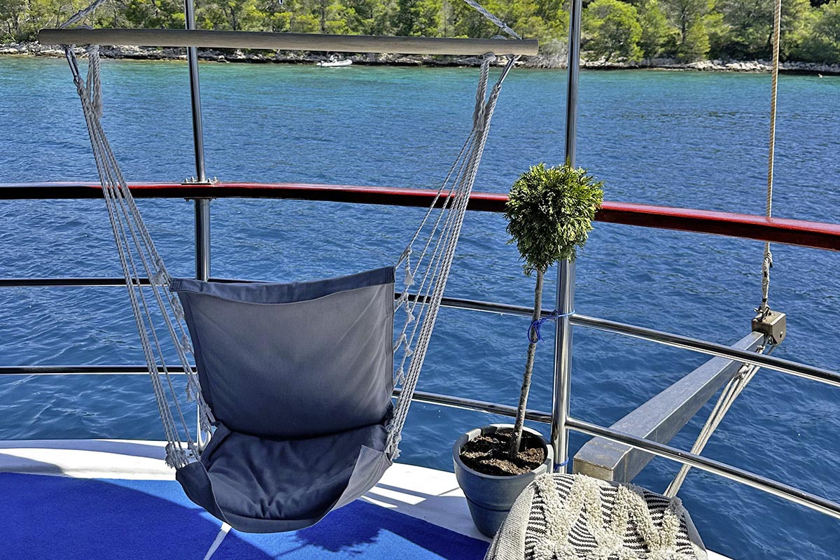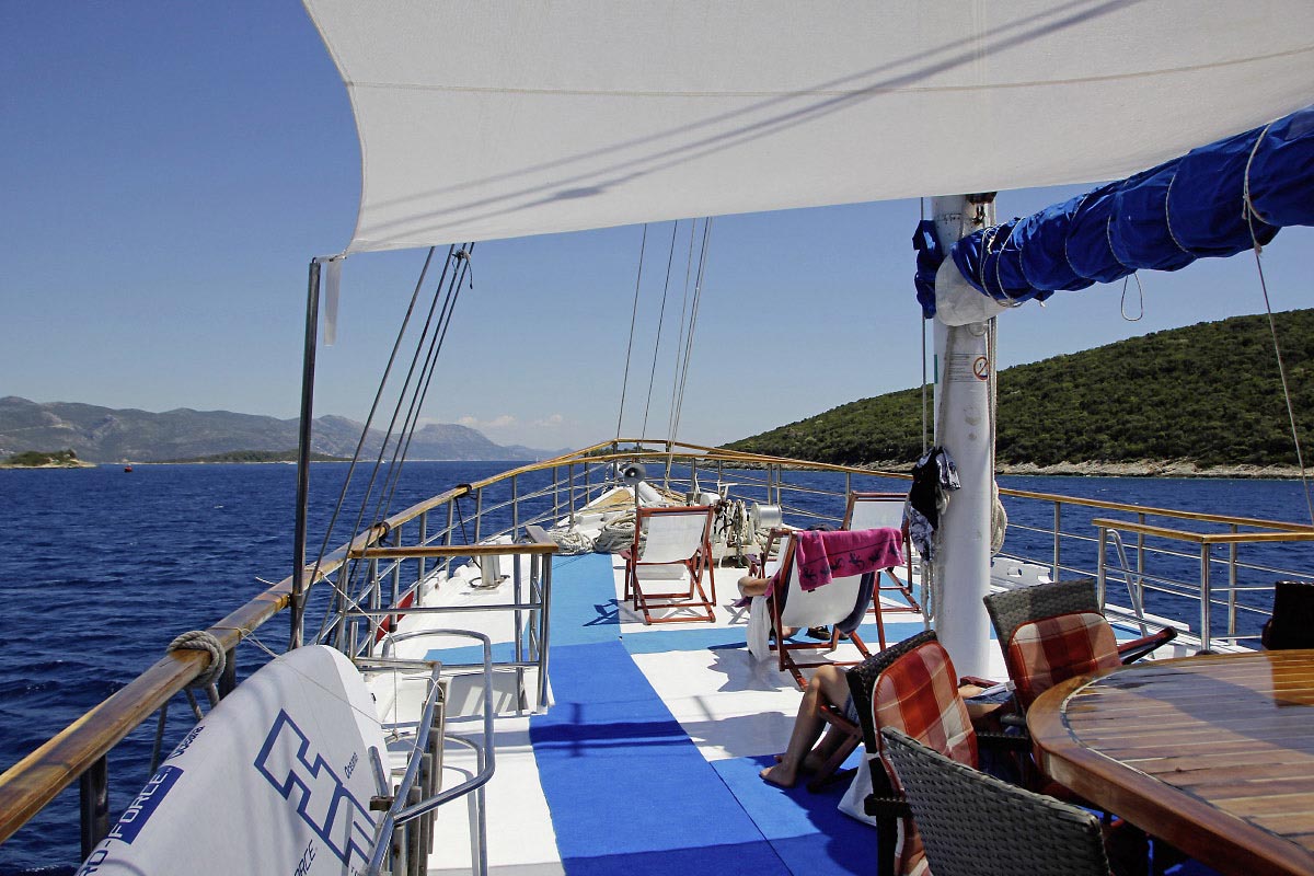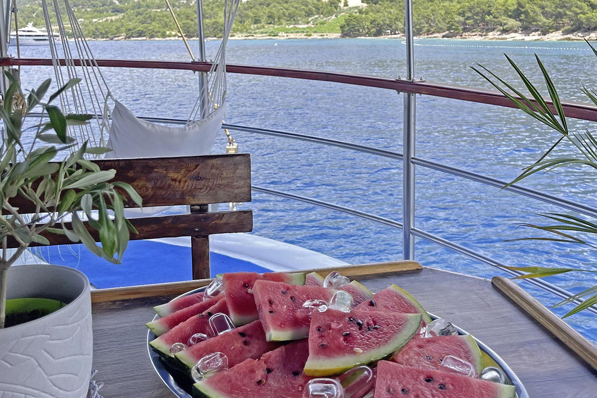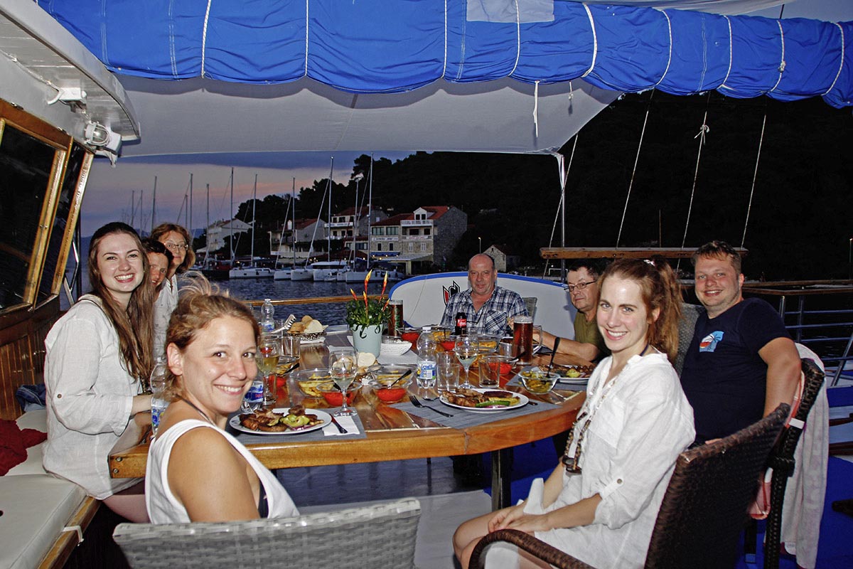 Naši gosti cijene opuštenu atmosferu na tradicionalnom drvenom brodu koji se ne može usporediti s modernim željeznim brodovima. Tijekom plovidbe možete se sunčati na jednoj od dvije sunčane palube, zajedno sjediti za velikim stolom ispred kormilarnice ili se prepustiti valovima da vas lagano ljuljaju u visećim stolicama na natkrivenoj krmi. U pauzama za kupanje u najljepšim uvalama dalmatinskih otoka, neki se gosti odvaže na hrabri skok s gornje palube, plutaju morem na jednom od luftića kojih ima na brodu ili se okušaju u stojećem veslanju (stand-up paddling). A ako ste nakon toga žedni, Larisa će vas razmaziti ledenim pivom, čašom vina ili koktelom.