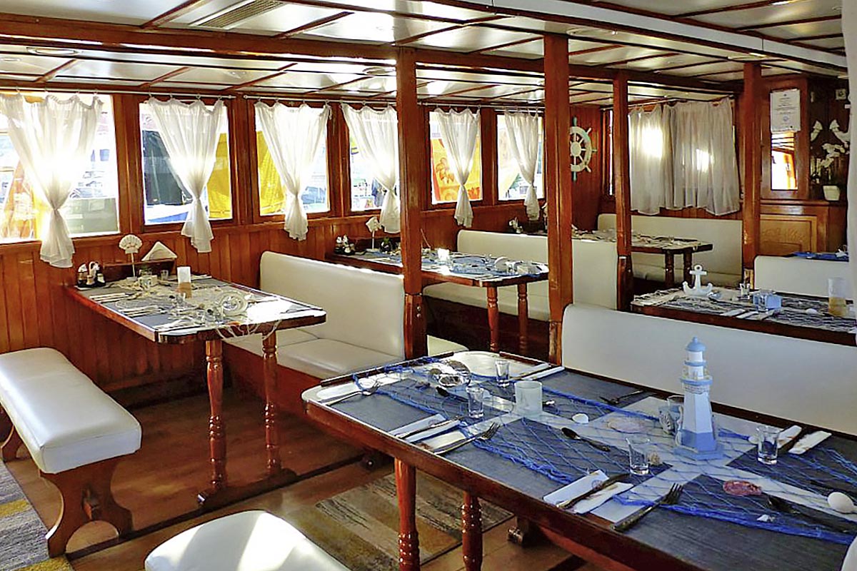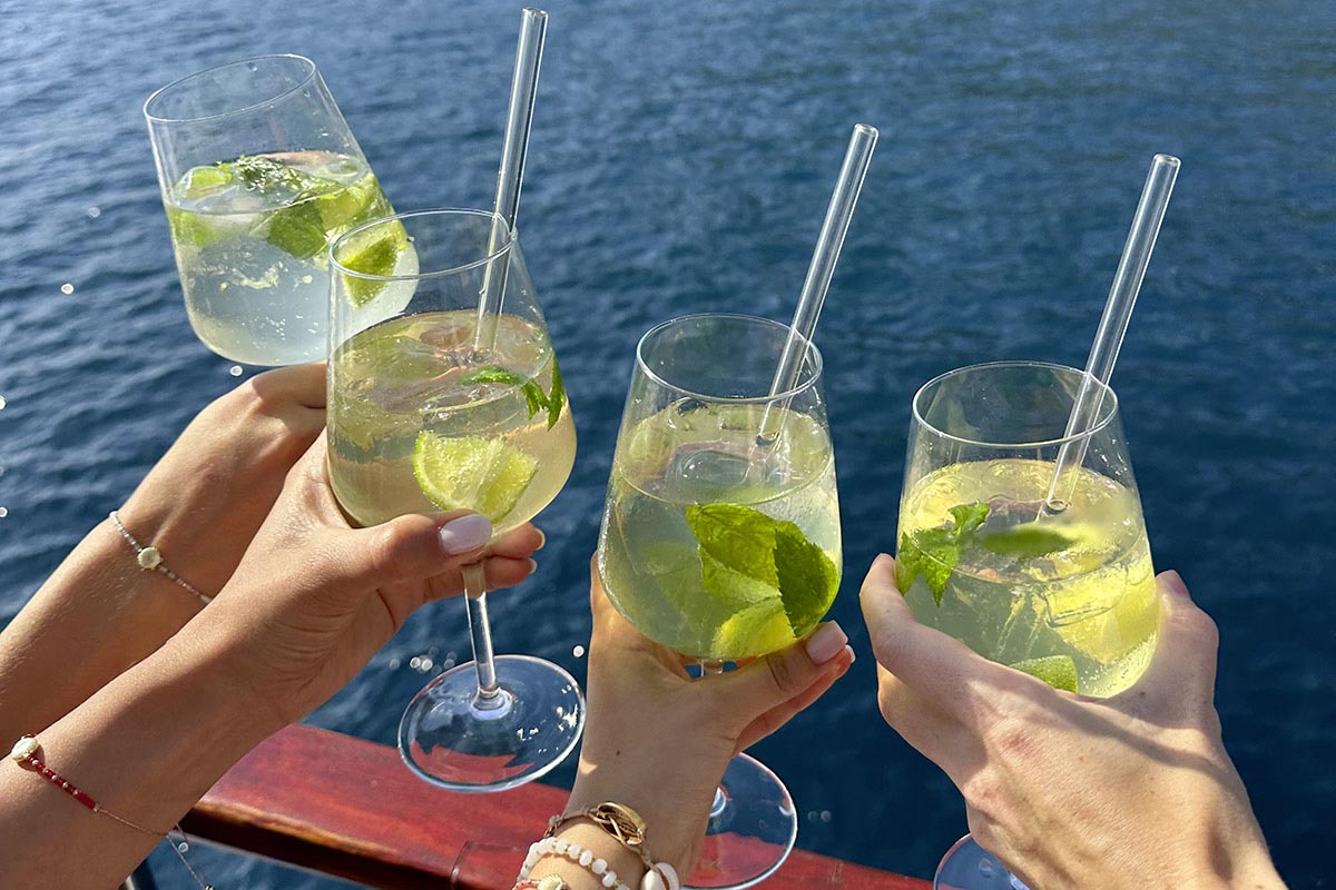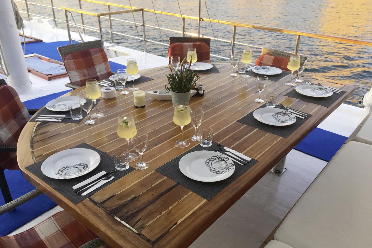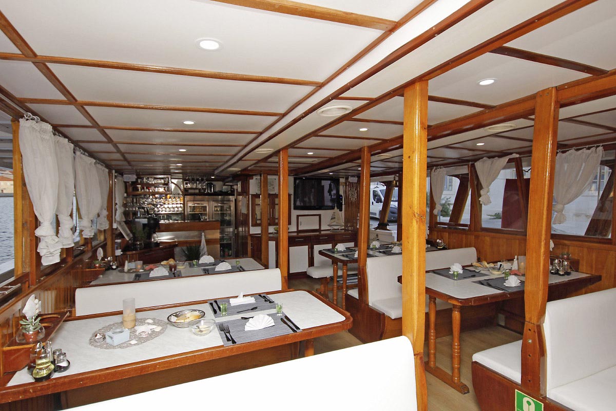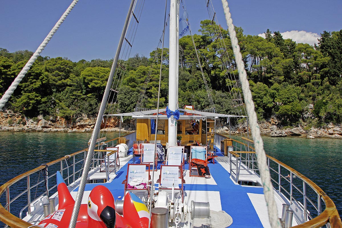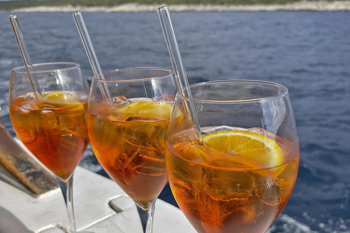 Naši gosti cijene opuštenu atmosferu na tradicionalnom drvenom brodu koji se ne može usporediti s modernim željeznim brodovima. Tijekom plovidbe možete se sunčati na jednoj od dvije sunčane palube, zajedno sjediti za velikim stolom ispred kormilarnice ili se prepustiti valovima da vas lagano ljuljaju u visećim stolicama na natkrivenoj krmi. U pauzama za kupanje u najljepšim uvalama dalmatinskih otoka, neki se gosti odvaže na hrabri skok s gornje palube, plutaju morem na jednom od luftića kojih ima na brodu ili se okušaju u stojećem veslanju (stand-up paddling). A ako ste nakon toga žedni, Larisa će vas razmaziti ledenim pivom, čašom vina ili koktelom.
