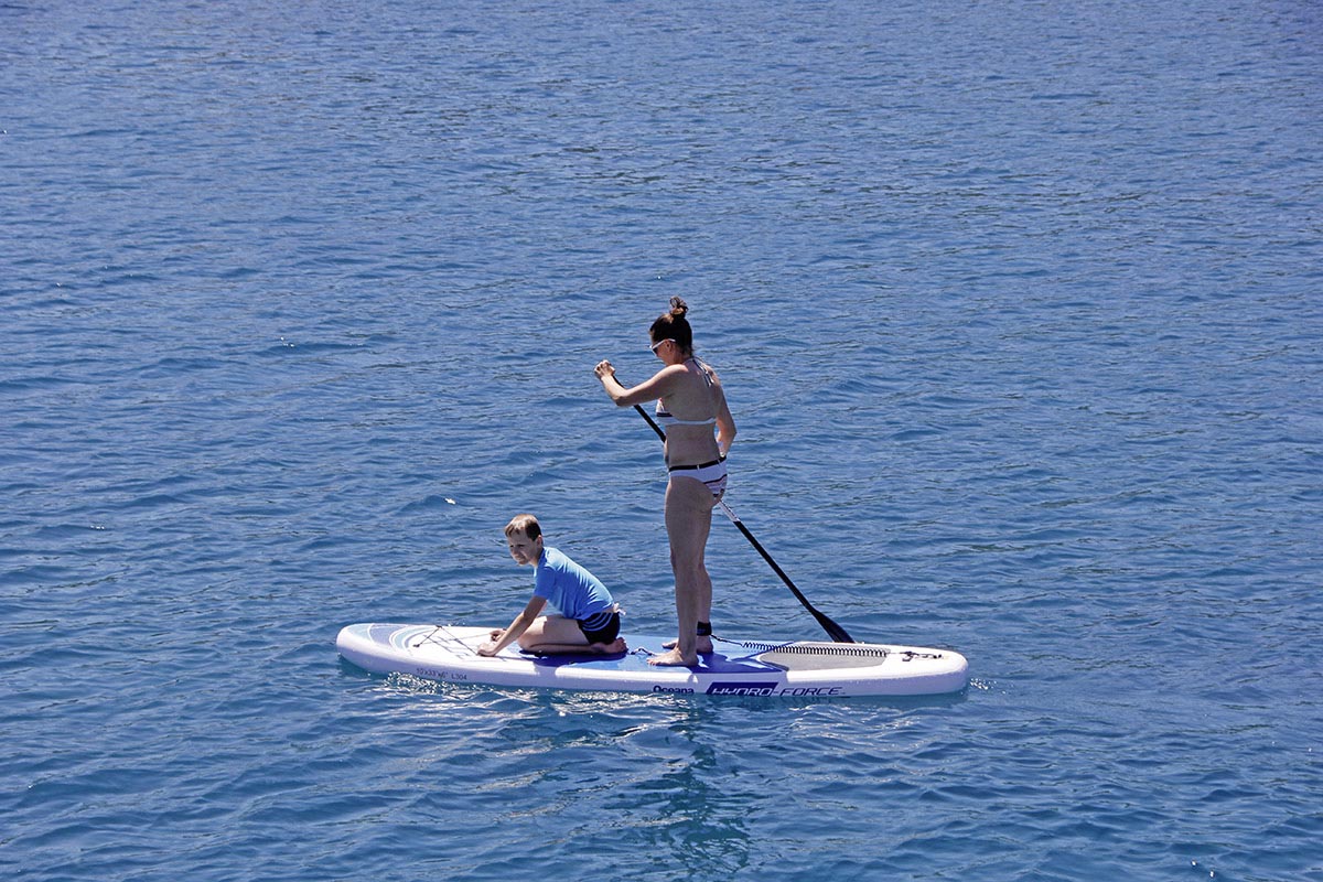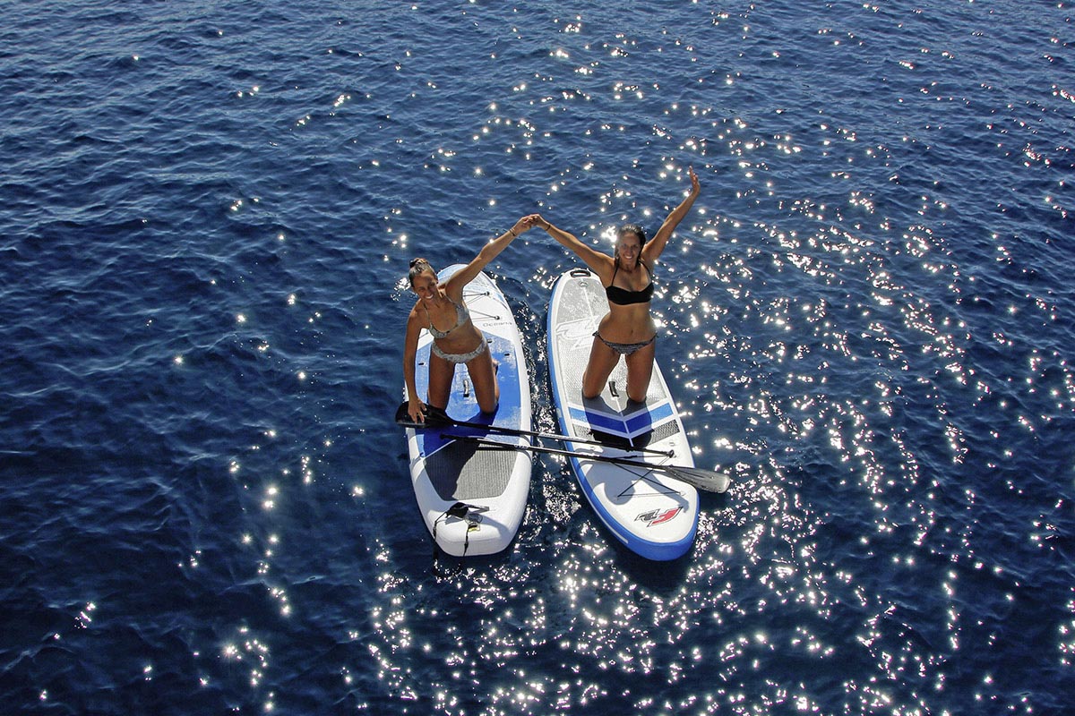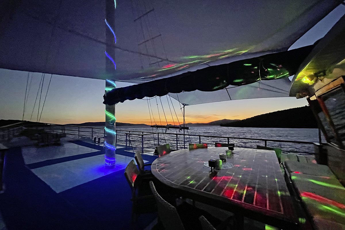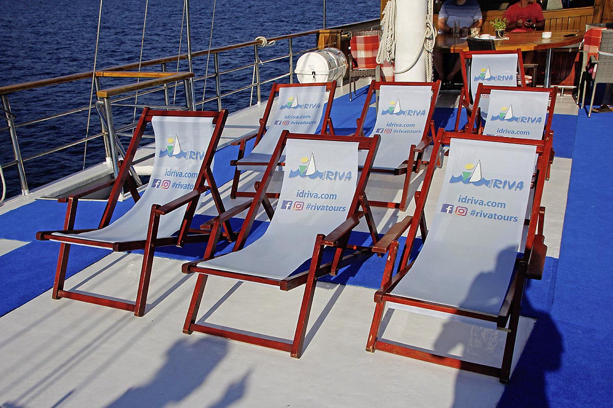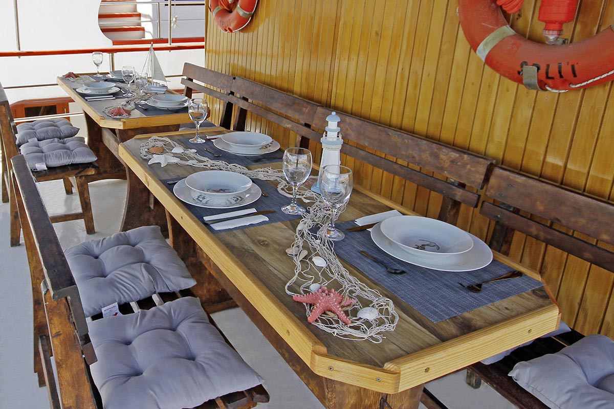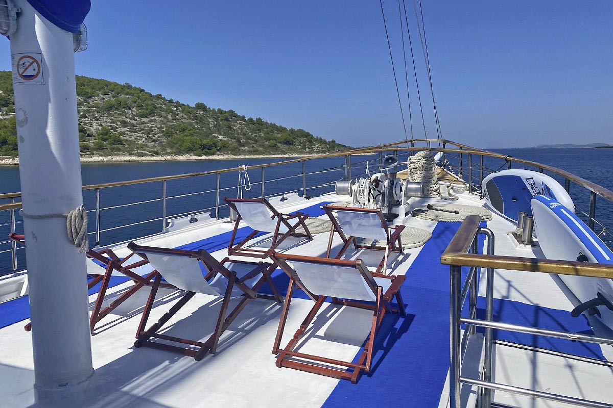 Dvije sunčane palube (cca. 70 i 50 m²) sa oko 20 ležaljki. Madraci za sunčanje za 4 osobe, stolovi s klupom i stolicama, kao i tendom na provi gornje palube za cca. 20 osoba, 2 viseće stolice i stolovi s klupama na natkrivenoj krmi gornje palube za cca. 12 osoba, salon sa klima uređajem za 36 osoba. Dva SUP-a (daske za stojeće veslanje) i luftići itd. na rapolaganju su besplatno.