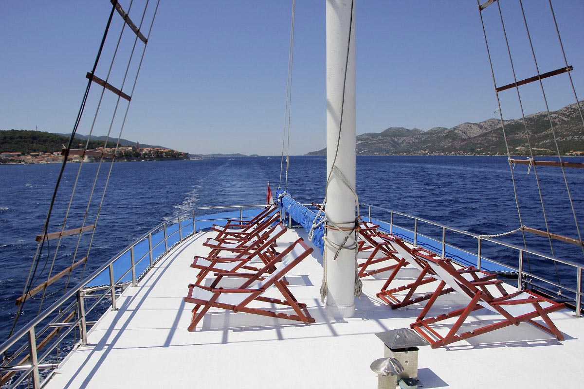 Rano ujutro napuštamo Split, prolazimo Splitska vrata između otoka Brača i Šolte i krećemo prema Hvaru – otok je poznat po blagoj klimi i velikim poljima lavande. Luka istoimenog glavnog grada na otoku Hvaru nalazi se u podnožju tvrđave s koje se pruža fantastičan pogled na arhipelag Paklenih otoka. U luci grada Hvara pristajemo oko 9:30 sati i imate dva sata da upoznate mjesto. Zatim nastavimo prema otoku Korčuli. Ručak tijekom plovidbe, poslijepodne jednosatna pauza za kupanje u Lovištu na sjeverozapadnom kraju poluotoka Pelješca. Nakon još sat vremena vožnje pristajemo direktno uz stari grad Korčule. Korčula je jedan od najljepših starih gradova u Dalmaciji i često je nazivaju „malim Dubrovnikom“ zbog svog izgleda poput tvrđave. Noćenje u rodnom mjestu slavnog moreplovca i istraživača Marka Pola.